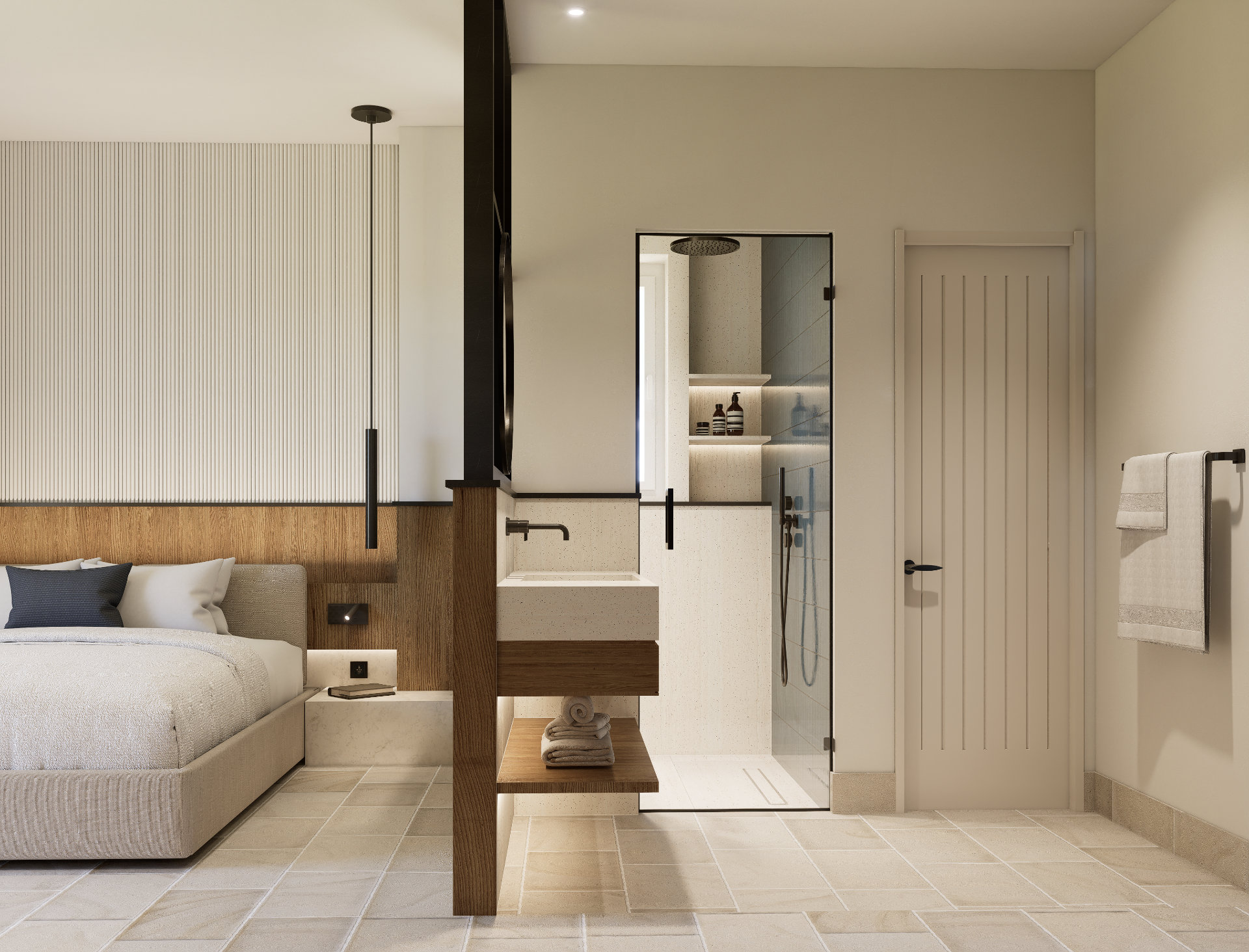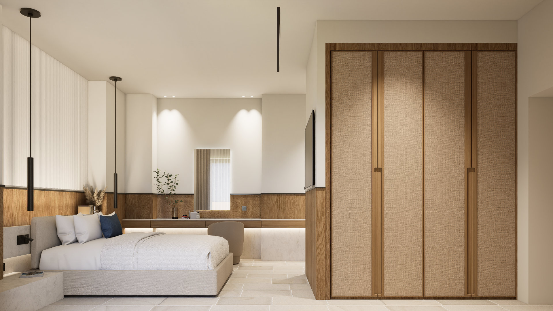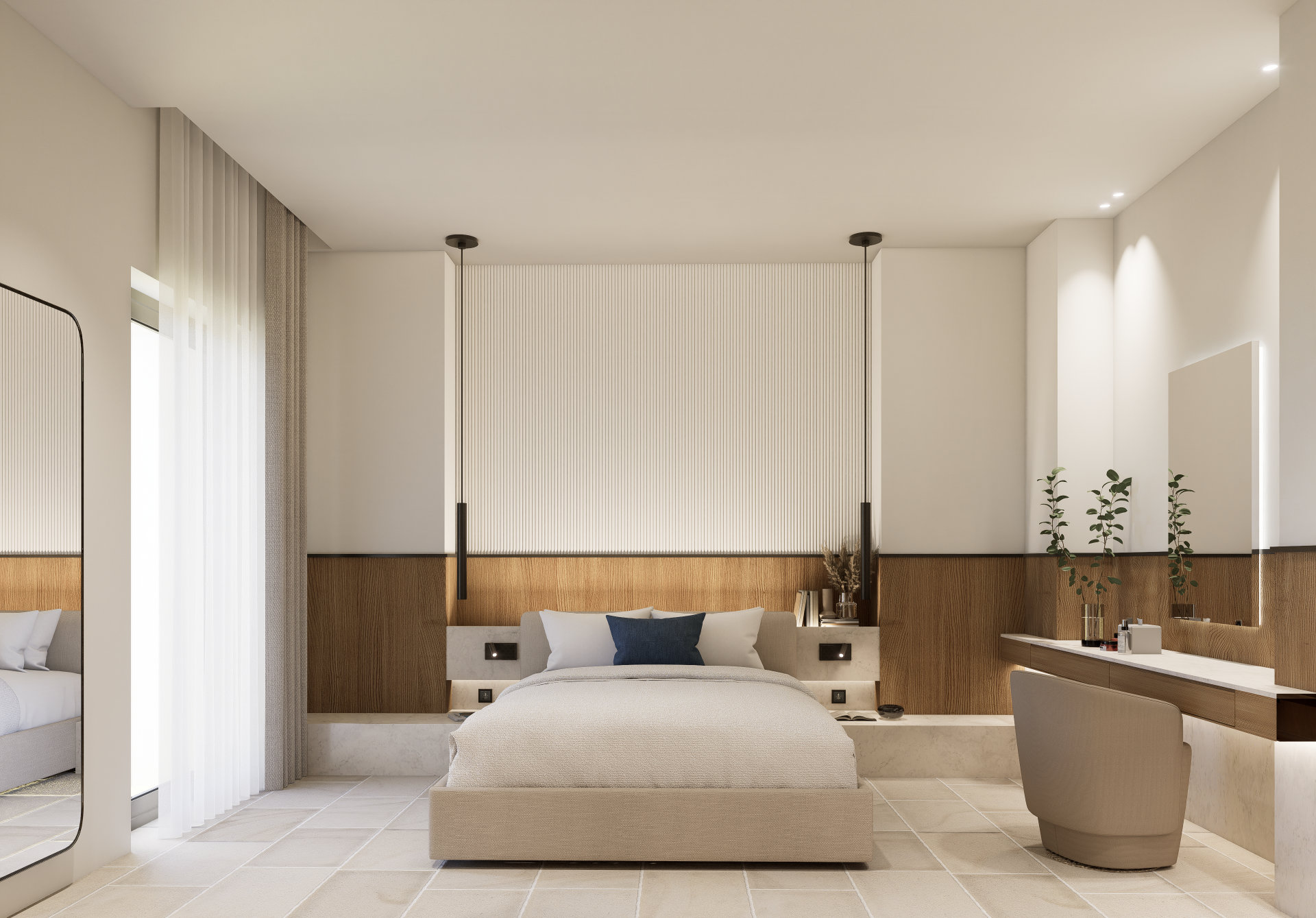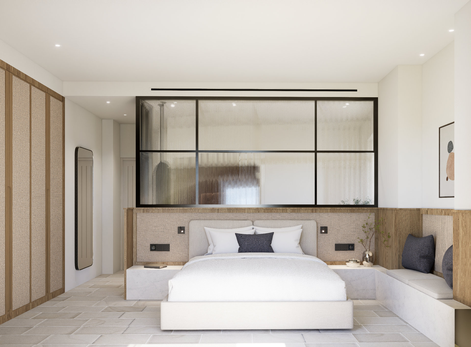 Sculptural marble elements and monolithic volumes in the kitchen and bedroom enhance the sense of quiet luxury, balancing raw natural materials with precise contemporary lines. The result is a timeless retreat where light, texture and craftsmanship shape a tranquil island living experience.