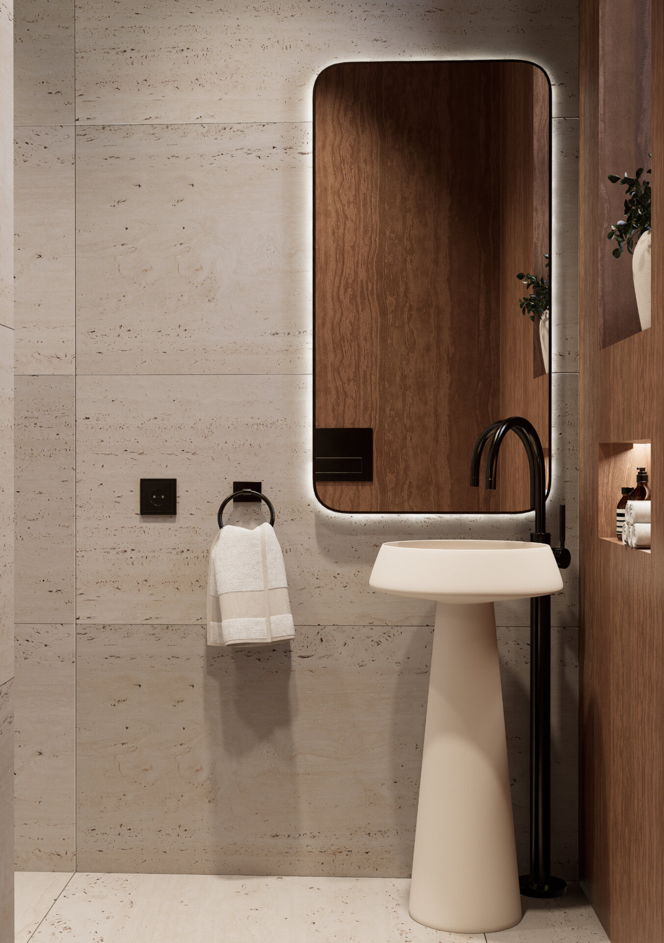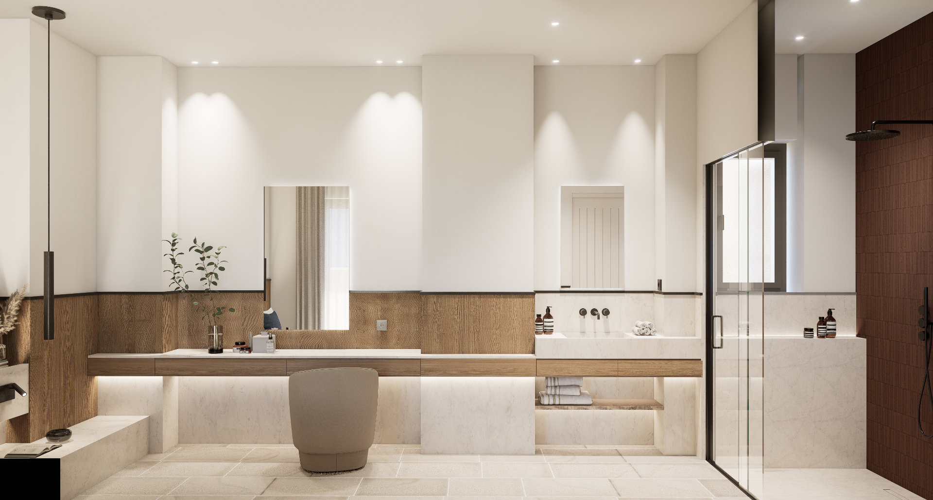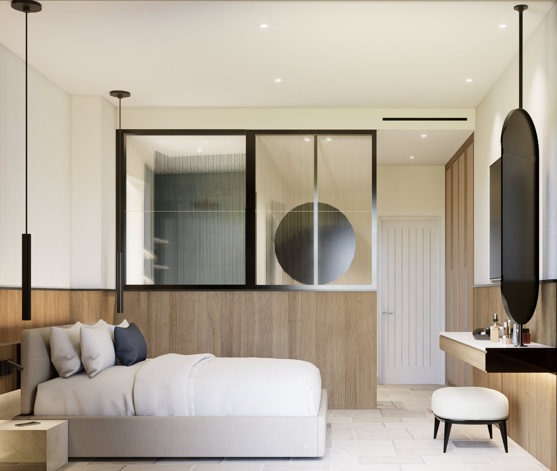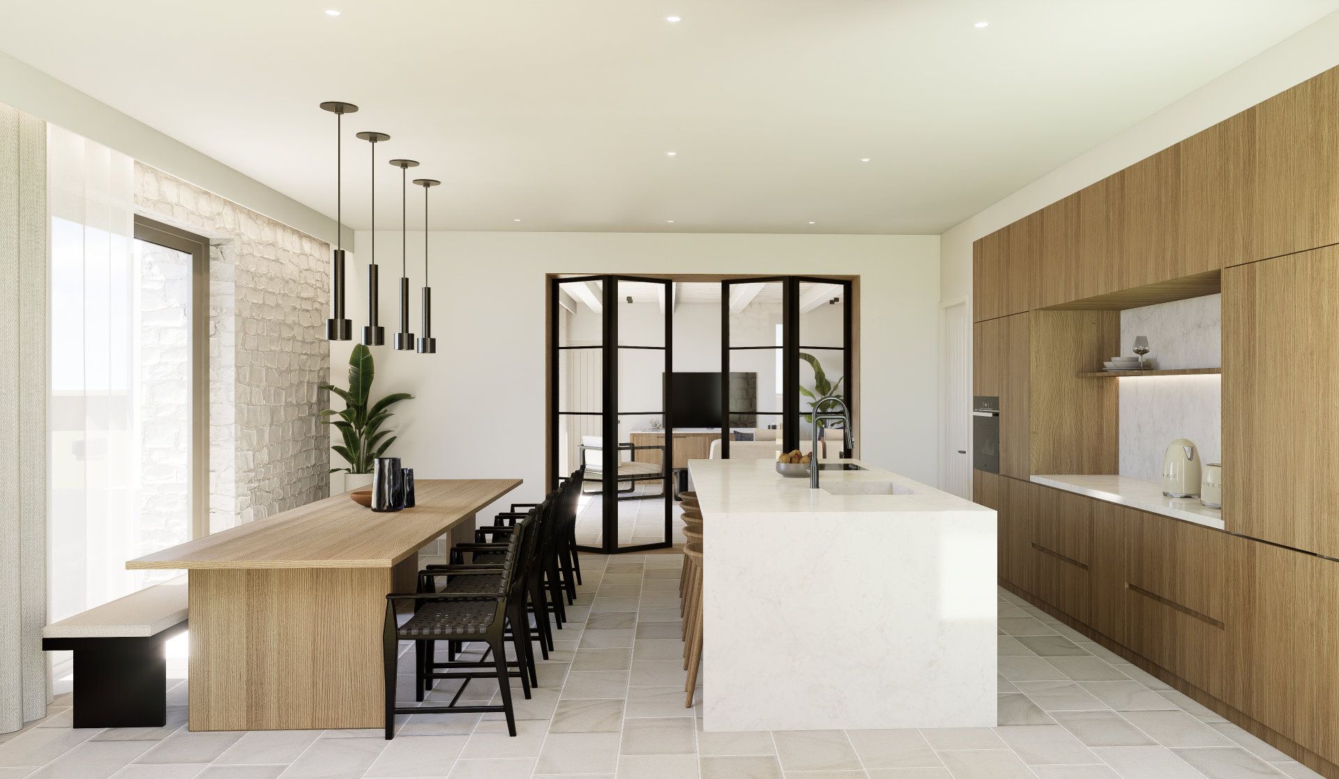 Sculptural marble elements and monolithic volumes in the kitchen and bedroom enhance the sense of quiet luxury, balancing raw natural materials with precise contemporary lines. The result is a timeless retreat where light, texture and craftsmanship shape a tranquil island living experience.