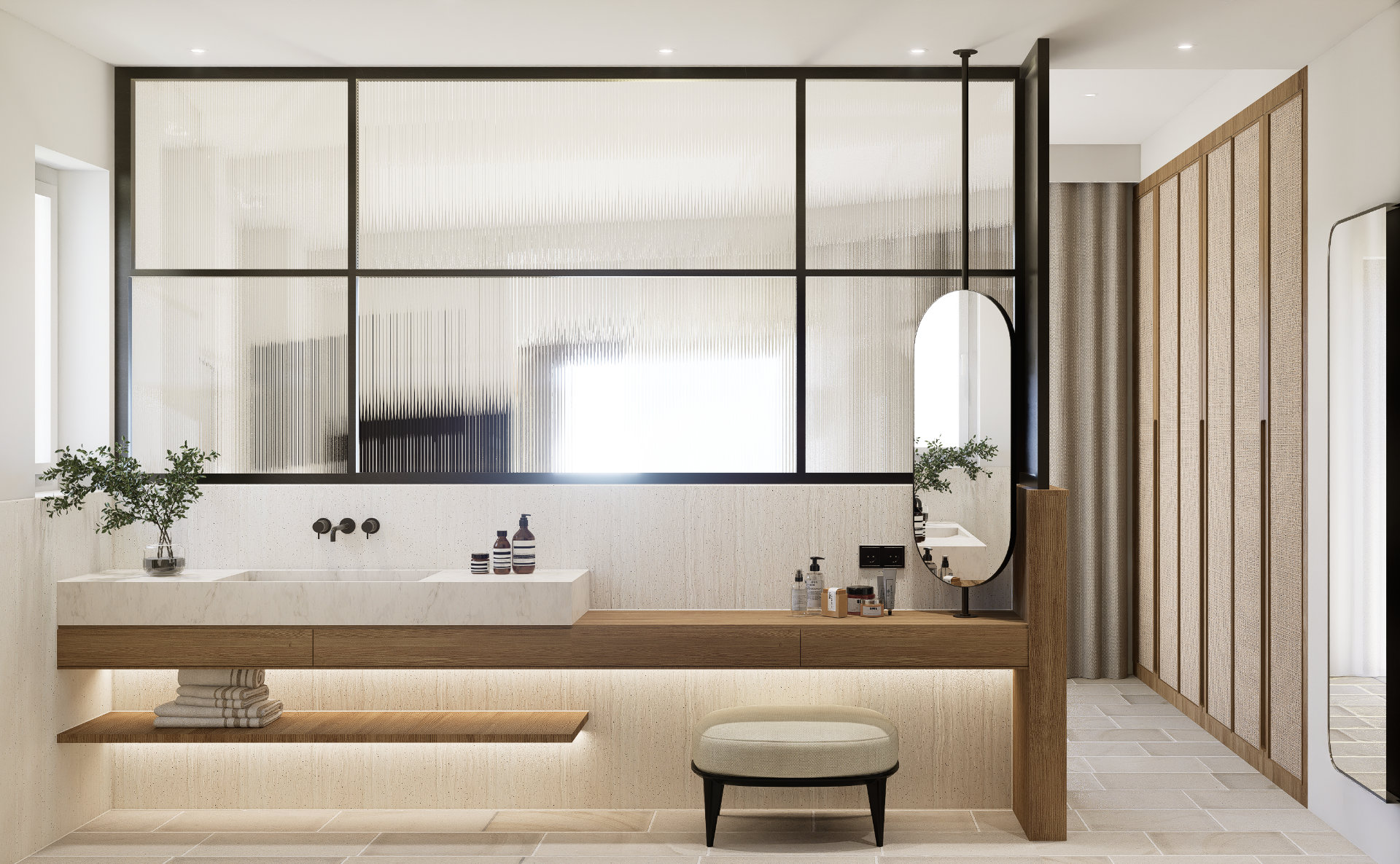 Textured plaster walls, light stone flooring and custom oak millwork create a seamless architectural language throughout, complemented by woven details and linen upholstery that add depth and softness.